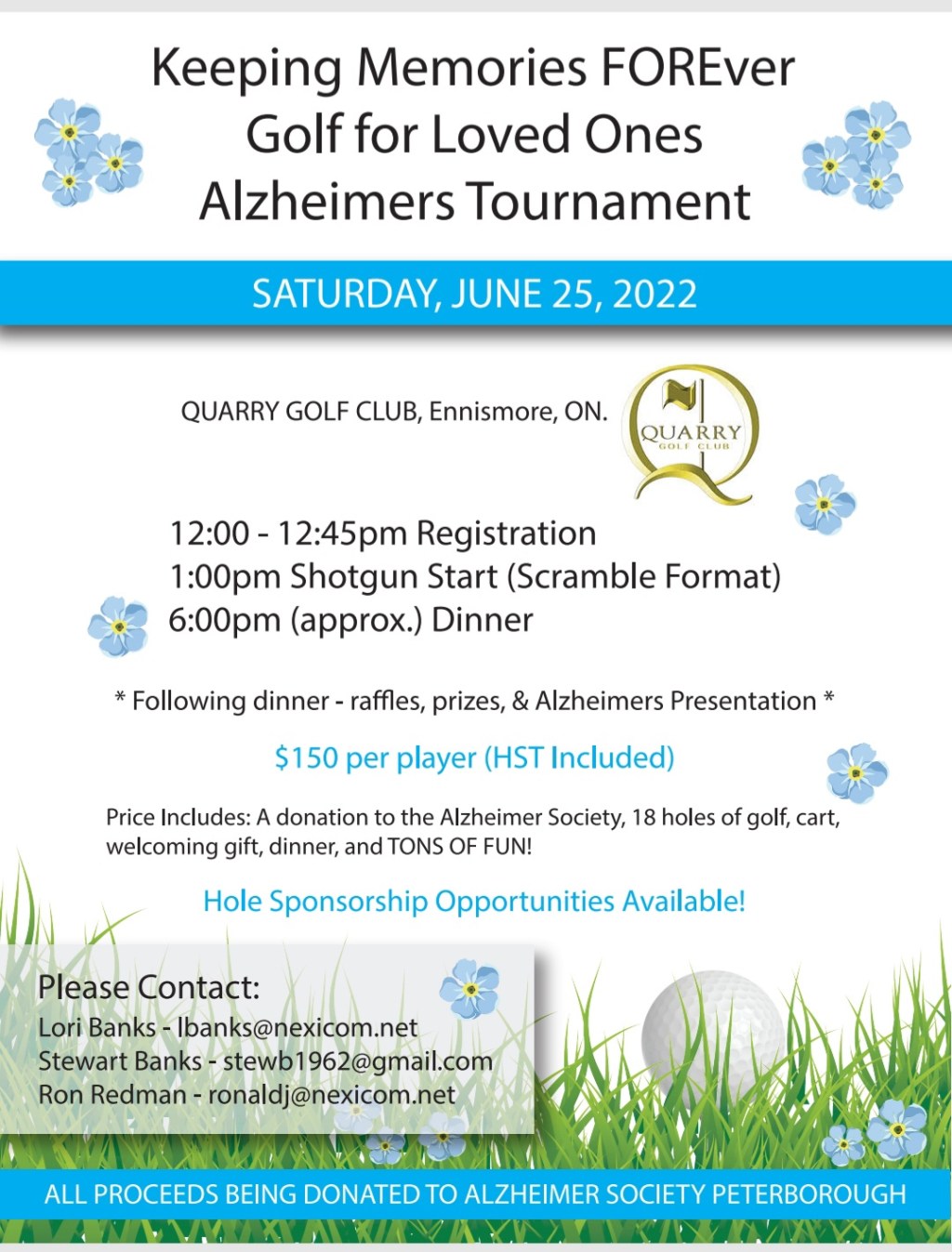 Golf for Loved Ones Where Quarry Golf Club Map When Jun 25/22 12:00 PM - Jun 25/22 07:00 PM Age All Price Starting at $150 Sign up for this charity golf tournament to raise funds for Alzheimers Society.
