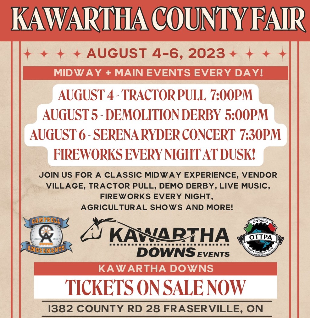 Welcome to The Kawartha County Fair! Kawartha Downs Events is proud to present this community event at our fairgrounds in August 2023. We are thrilled to bring a variety of entertainment to this year’s event! Guests can look forward to the classic midway experience, agricultural shows, our signature Tractor Pull on day 1, a demolition derby on day 2, Serena Ryder concert on day 3 – AND MORE, including a massive fireworks display at dusk each night! We look forward to bringing you the best family fun here at Kawartha Downs Events and can’t wait to see you at the Kawartha County Fair in August of 2023!