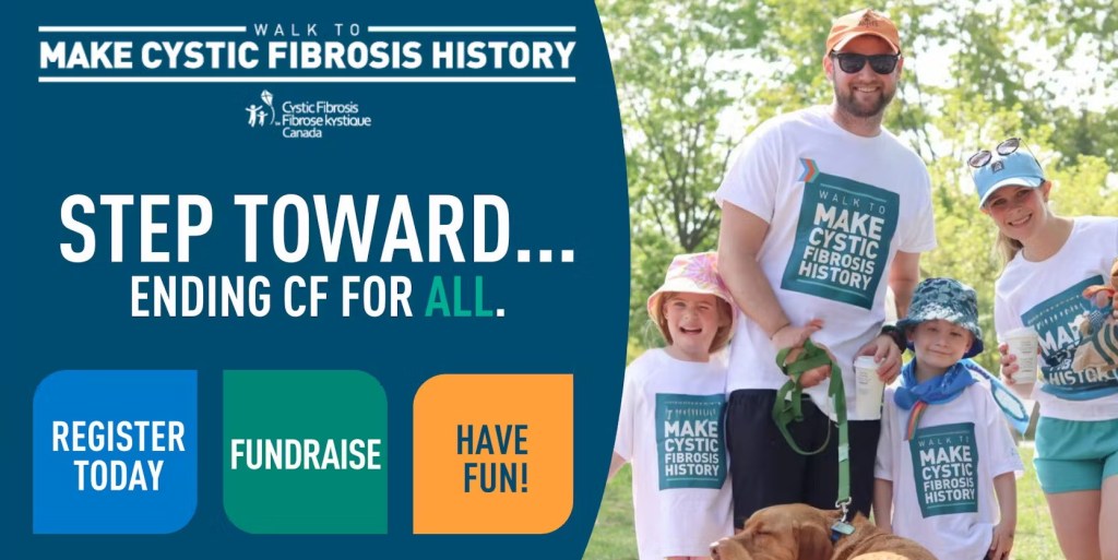 We invite you to join us in our community’s Walk To Make Cystic Fibrosis History on Sunday May 26, as we celebrate the Walk’s 20th year anniversary. This is CF Canada’s largest fundraising event that brings us together with one aim – fundraising to make an impact on the cystic fibrosis landscape and ensure that no-one is left behind.