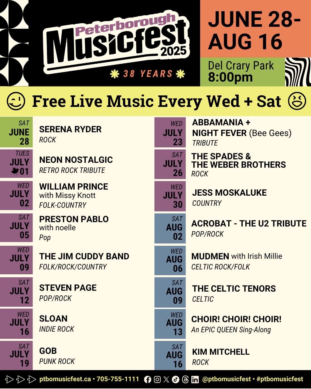 Peterborough Musicfest Where Del Crary Park, 100 George Street North, Peterborough, Ontario Map When Jun 28/25 08:00 PM - Aug 16/25 10:00 PM Age All Price Starting at $FREE Website https://www.ptbomusicfest.ca/