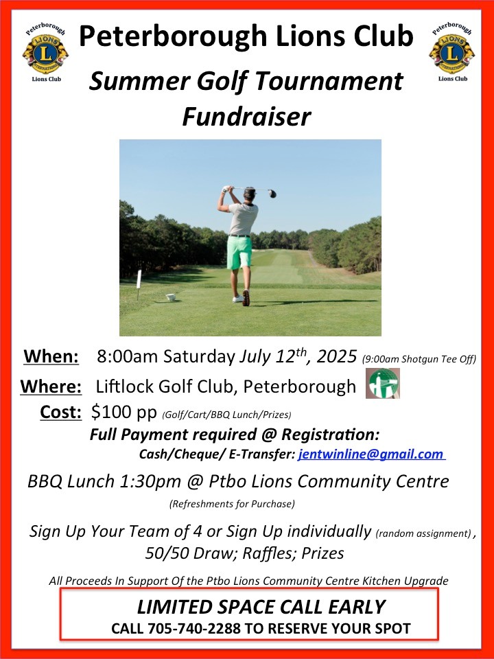 Join the Peterborough Lions Club at Liftlock Golf Club in Peterborough on Saturday July 12 for their Summer Golf Tournament Fundraiser.