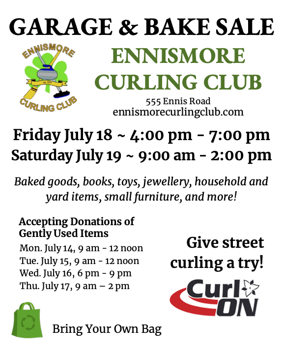 The Ennismore Curling Club hosts its annual garage and bake sale during the Ennismore Shamrock Festival, Friday July 18th 4:00 pm – 7:00 pm, and Saturday July 19, 2025 9:00 am – 2:00 pm. We have books, puzzles, toys, jewelry, household and gardening items, and much more. Home-baked treats are plentiful at the bake sale. Plus, you can give Street Curling a try!