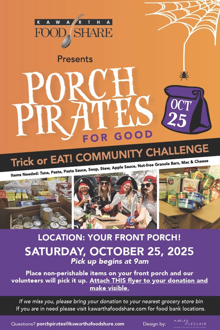 What is it: An essential food drive to restock the shelves at Kawartha Food Share. On Saturday October 25th, neighbours are being asked to leave a bag of non-perishable food items on their front porch at 9am and attach the Porch Pirates flyer (or anything that makes the donation easy to identify.) Volunteer porch pirates will drive around the city and collect the items and deliver them to the KFS warehouse. Keep your eyes peeled for our flyers that are being distributed the week leading up to collection day. In the last 5 years, our pirates have brought in over 185,000 pounds of food and over $20,000 in monetary donations!