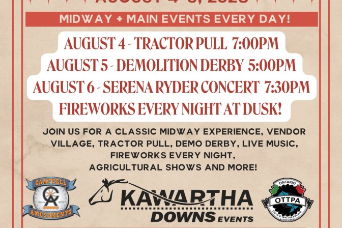 Kawartha Downs, 1382 County Road 28, Fraserville, ONTARIO, K0L-1V0 Welcome to The Kawartha County Fair! Kawartha Downs Events is proud to present this community event at our fairgrounds in August 2023. We are thrilled to bring a variety of entertainment to this year’s event! Guests can look forward to the classic midway experience, agricultural shows, our signature Tractor Pull on day 1, a demolition […]
