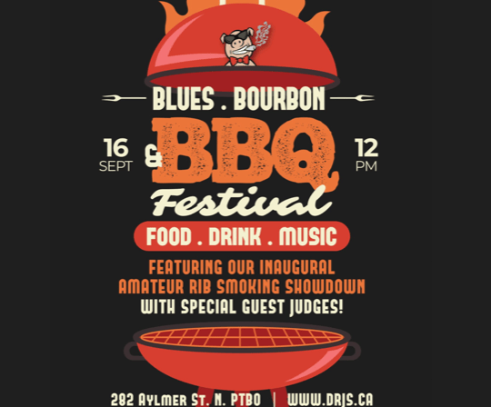 Dr. J's BBQ & Brews, 282 Aylmer St N, Peterborough, ON, Canada The Blues, Bourbon and BBQ Festival is coming to Peterborough on Saturday, September 16 from 12pm – 7pm.